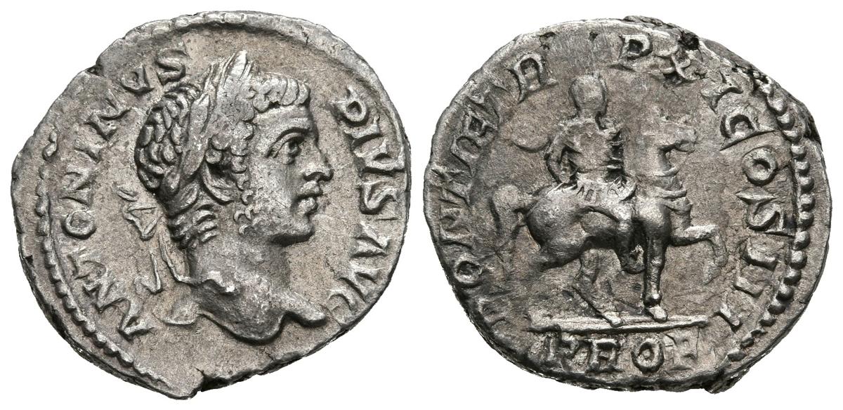 CARACALLA. Denario. (Ar. 3,13g/19mm). 208 d.C. Roma. (RIC 108). Anv: Busto laureado de Caracalla a derecha, alrededor leyenda: ANTONINVS PIVS AVG. Rev: Caracalla con atuendo militar sobre caballo a derecha, en exergo: PROF, alrededor leyenda: PONTIF TR P XI COS III. MBC+.