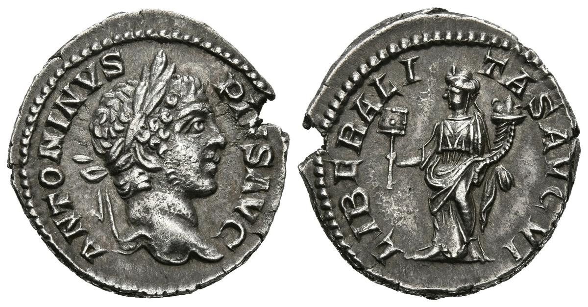 CARACALLA. Denario. (Ar. 3,36g/19mm). 206-210 d.C. Roma. (RIC 158). Anv: Cabeza laureada de Caracalla a derecha, alrededor leyenda: ANTONINVS PIVS AVG. Rev: Liberalitas estante a izquierda portnado caduceo y cornucopia, alrededor leyenda: LIBERALITAS AVG VI. EBC-. Defecto en el cospel.