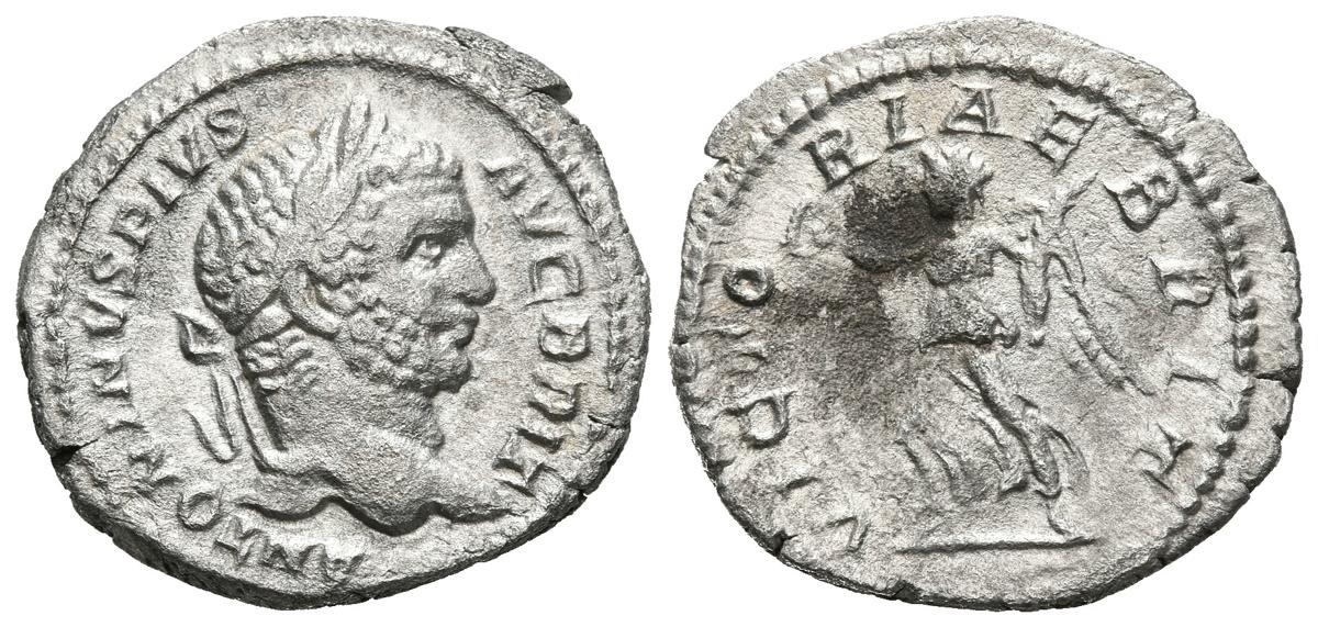 CARACALLA. Denario. (Ar. 2,63g/19mm). 210-213 d.C. Roma. (RIC 231). Anv: Cabeza laureada de Caracalla a derecha, alrededor leyenda: ANTONINVS PIVS AVG BRIT. Rev: Victoria avanzando a izquierda portando palma y corona de laurel, alrededor leyenda: VICTORIAE BRIT. MBC.