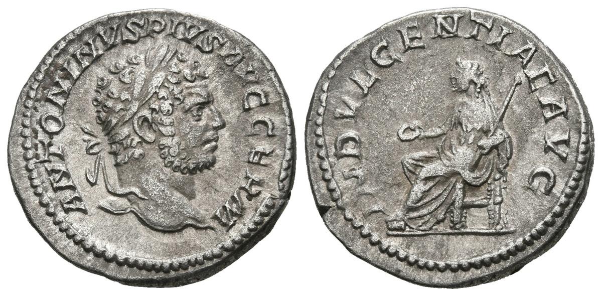 CARACALLA. Denario (Ar. 3,00g/19mm). 213-217 d.C. Roma. (RIC 300). Anv: Cabeza laureada de Caracalla a derecha, alrededor leyenda: ANTONINVS PIVS AVG GERM. Rev: Indulgencia sentada a izquierda portando patera y cetro, alrededor leyenda: INDVLGENTIAE AVG. MBC+.