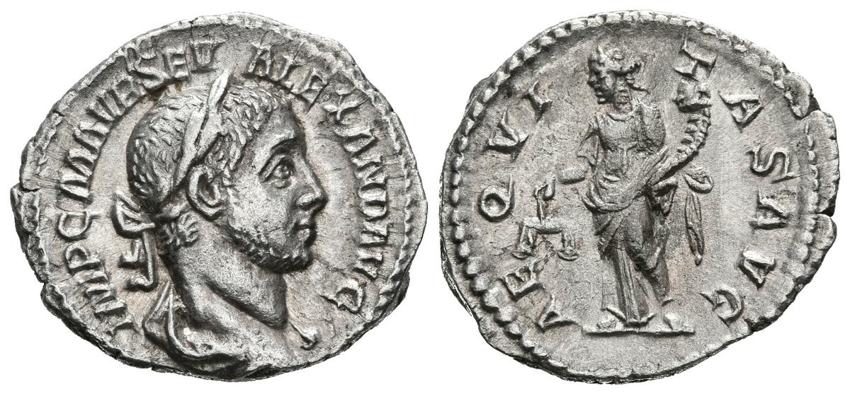 ALEJANDRO SEVERO. Denario. (Ar. 2,20g/19mm). 222-228 d.C. Roma. (RIC 127). Anv: Busto laureado y drapeado de Alejandro Severo a derecha, alrededor leyeda: IMP C M AVR SEV ALEXAND AVG. Rev: Aequitas en pie a izquierda portando cornucopia y escalas, alrededor leyenda: AEQVITAS AVG. MBC+.