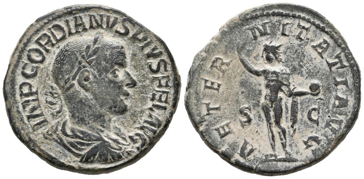 GORDIANO III. Sestercio. (Ae. 19,26g/32mm). 238-244 d.C. Roma. (RIC 297a). Anv: Busto laureado y drapeado de Gordiano III a derecha, alrededor leyenda: IMP GORDIANVS PIVS FEL AVG. Rev: Sol estante a izquierda alzando mano derecha y portando globo, entre S-C, alrededor leyenda: AETERNITATI AVG. MBC.