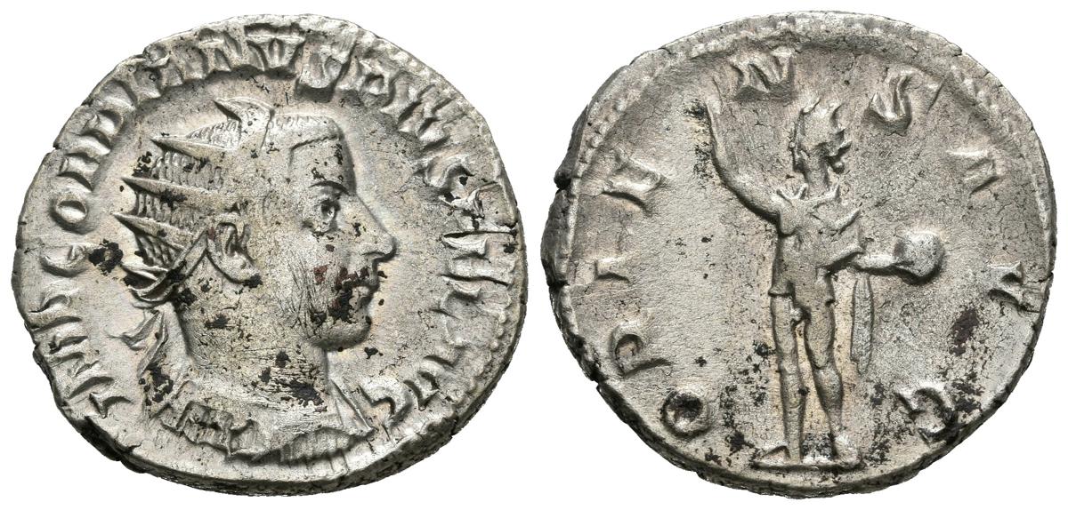 GORDIANO III. Antoniniano. (Ar. 4,47g/22mm). 242-244 d.C. Antioquía. (RIC 213). Anv: Busto radiado y drapeado de Gordiano III a derecha, alrededor leyenda: IMP GORDIANVS PIVS FEL AVG. Rev: Sol estante a izquierda radiado portando globo y alzando mano derecha, arededor leyenda: ORIENS AVG. MBC.