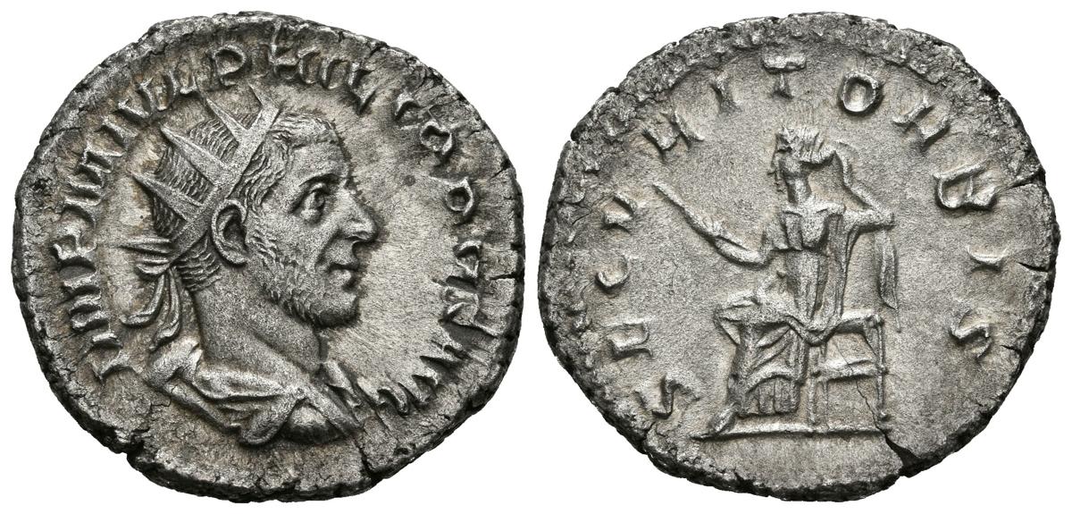 FILIPO I. Antoniniano. (Ar. 4,90g/22mm). 244-247 d.C. Roma. (RIC 48b). Anv: Busto radiado, drapeado y con coraza, alrededor leyenda: IMP M IVL PHILIPPVS AVG. Rev: Securitas sentada a izquierda portando vara, alrededor leyenda: SECVRIT ORBIS. MBC+.
