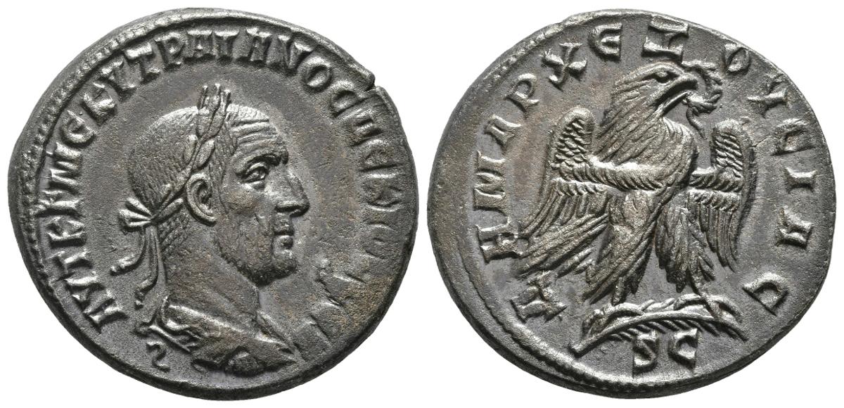 TRAJANO DECIO. Tetradracma. (Ve. 10,58g/26mm). 249-251 d.C. Antioquía. (Prieur 510). Anv: Busto laureado y drapeado de Trajano Decio a derecha, alrededor leyenda griega. Rev: Aguila con corona de laurel sobre palma, debajo SC, alrededor leyenda griega. MBC+/EBC-.