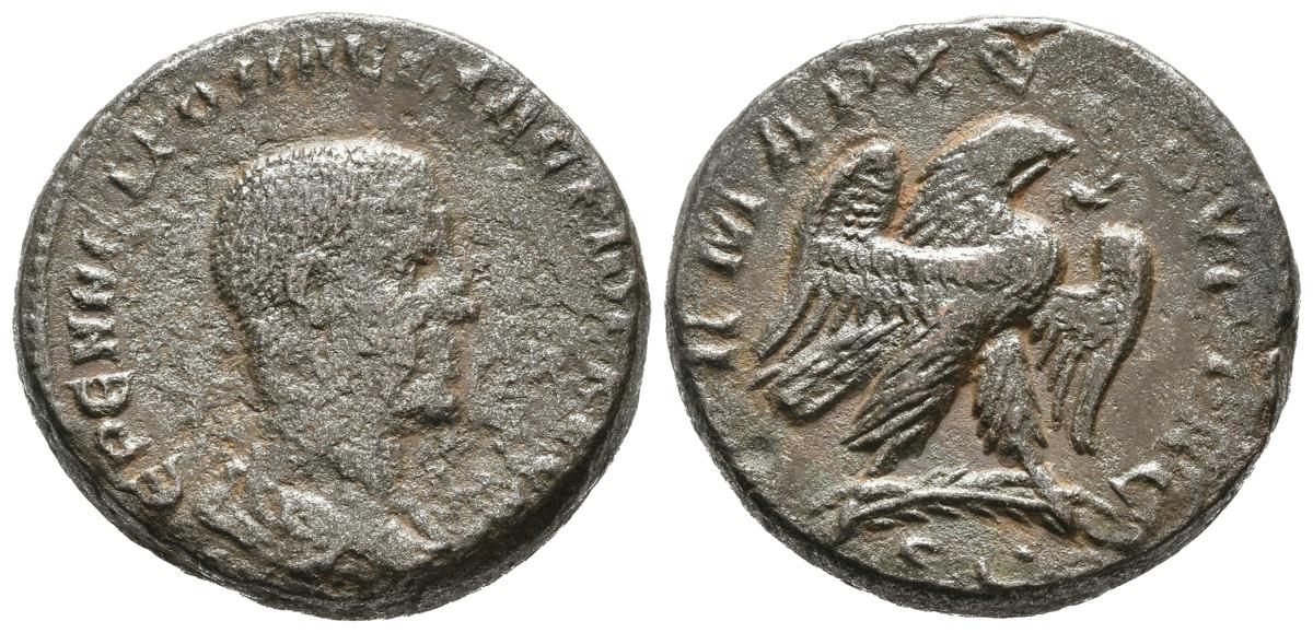 HERENIO ETRUSCO. Tetradracma. (Ve. 10,38g/24mm). 250-251 d.C. Antioquía. (Prieur 635). Anv: Busto drapeado de Herenio Etrusco a derecha, alrededor leyenda. Rev: Aguila con corona de laurel sobre palma a derecha, debajo: SC, alrededor leyenda. MBC.