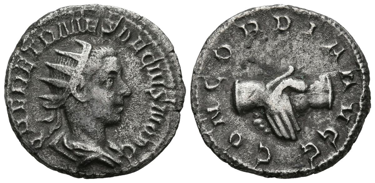 HERENIO ETRUSCO. Antoniniano. (Ar. 3,90g/21mm). 250-251 d.C. Roma. (RIC 138). Anv: Busto drapeado y radiado de Herenio Etrusco a derecha, alrededor leyenda: Q HER ETR MES DECIVS NOB C. Rev: Manos entrelazadas, alrededor leyenda: CONCORDIA AVGG. MBC. Raro.