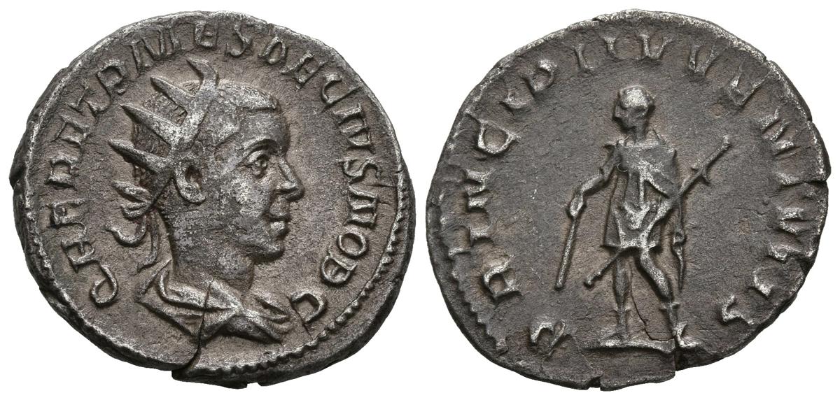 HERENIO ETRUSCO. Antoniniano. (Ar. 3,59g/22mm). 250-251 d.C. Roma. (RIC 147c). Anv: Busto radiado y drapeado de Herenio Etrusco a derecha, alrededor leyenda: Q HER ETR MES DECIVS NOB C. Rev: Herenio Etrusco estante a izquierda portando bastón y lanza, alrededor leyenda: PRINCIPI IVVENTVTIS. MBC.