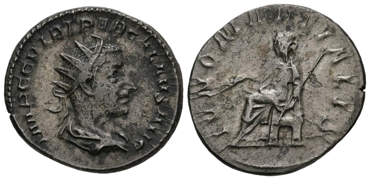 TREBONIANO GALO. Antoniniano. (Ar. 3,62g/22mm). 252 d.C. Roma. (RIC 69). Anv: Busto radiado y drapeado de Treboniano Galo a derecha, alrededor leyenda: IMP C C VIB TREB GALLVS AVG. Rev: Juno sentado a izquierda portando cetro y espigas, alrededor leyenda: IVNO MARTIALIS. MBC.