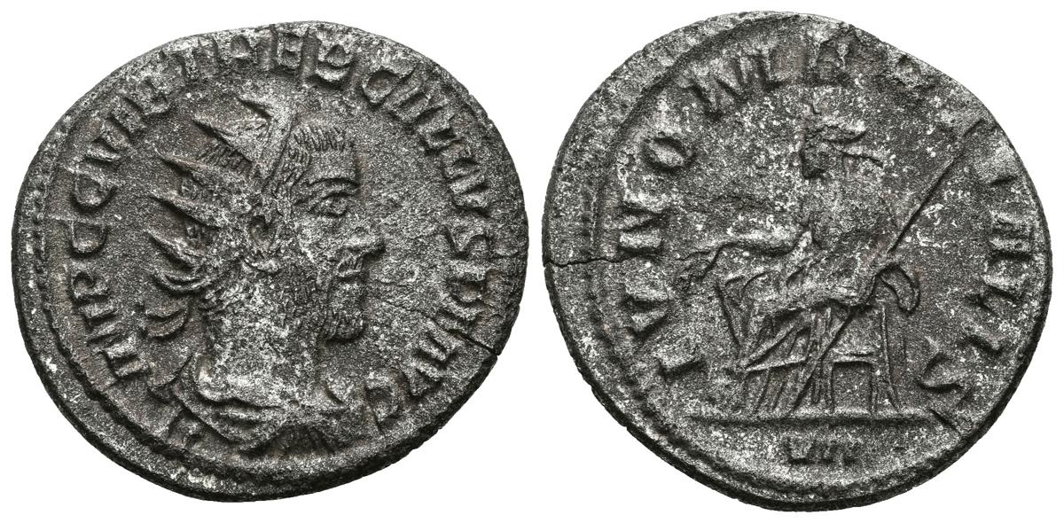 TREBONIANO GALO. Antoniniano. (Ar. 3,30g/22mm). 251-253 d.C. Antioquía. (RIC 83). Anv: Busto radiado y drapeado de Treboniano Galo a derecha, alrededor leyenda: IMP C C VIB TREB GALLVS P F AVG. Rev: Juno sentado a izquierda portando espigas y cetro, debajo: VII, alrededor leyenda: IVNO MARTIALIS. MBC. Plata porosa.