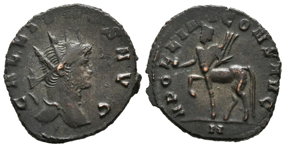 GALIENO. Antoniniano. (Ae. 2,99g/21mm). 267-268 d.C. Roma. (RIC 164). Anv: Cabeza radiada de Galieno a derecha, alrededor leyenda: GALLIENVS AVG. Rev: Centauro con globo y carcaj a izquierda, debajo A, alrededor leyenda: APOLLONI CONS AVG. MBC+.