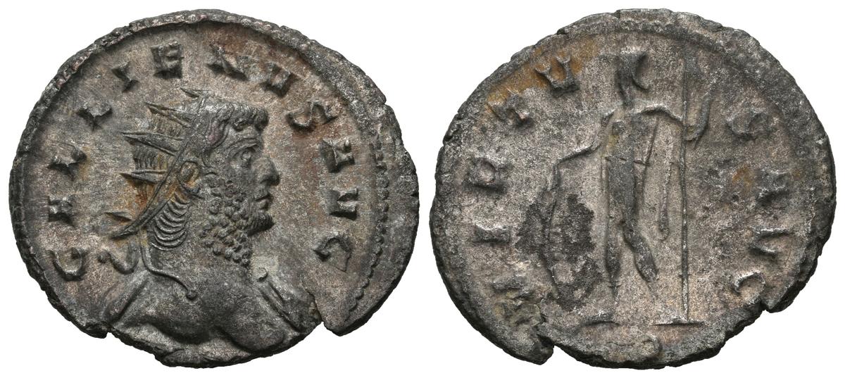 GALIENO. Antoniniano. (Ae. 3,16g/23mm). 260-262 d.C. Roma. (RIC 325 var). Anv: Busto radiado de Galieno a derecha, alrededor leyenda: GALLIENVS AVG. Rev: Virtus estante a izquierda portando escudo y lanza, alrededor leyenda: VIRTVS AVG. EBC-/MBC.
