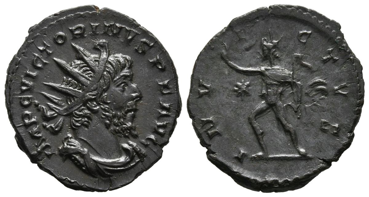 VICTORINO. Antoniniano. (Ae. 2,84g/21mm). 268-270 a.C. Colonia Agrippensis. (RIC 114). Anv: Busto drapeado y radiado de Victorino a derecha, alrededor leyenda: IMP C VICTORINVS P F AVG. Rev: Sol avanzando a izquierda alzando mano derecha y portando látifo, delante estrella, alrededor leyenda: INVICTVS. EBC-/MBC+.