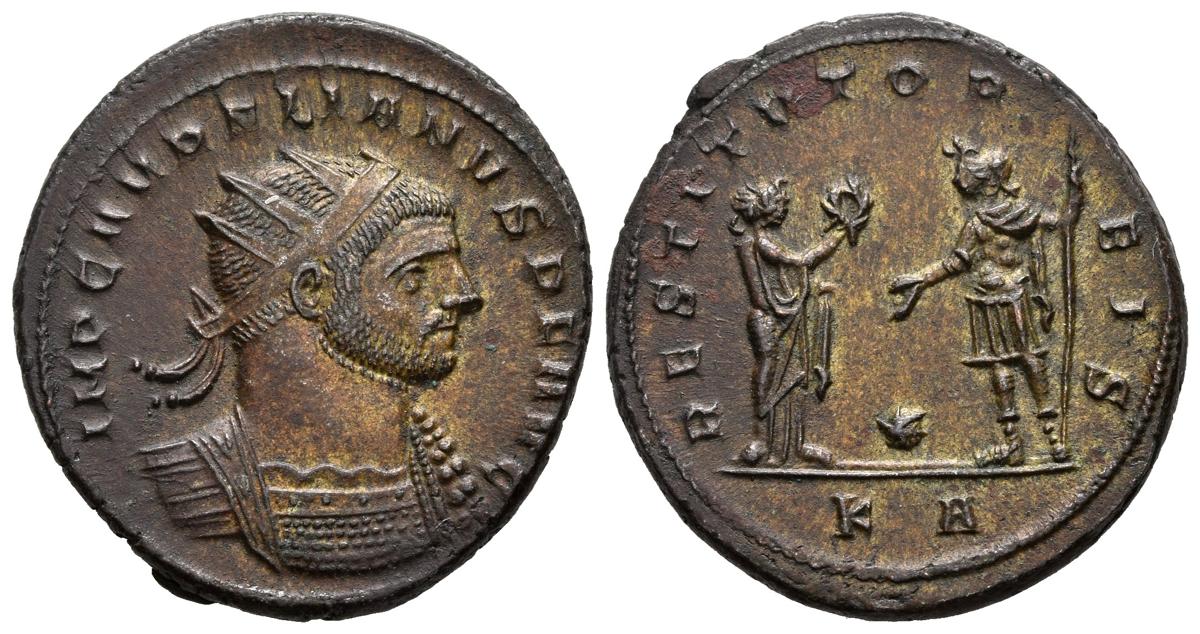 AURELIANO. Antoniniano. (Ae. 5,38g/23mm). 274-275 d.C. Serdica. (RIC 297 var). Anv: Busto radiado y acorazado de Aureliano a derecha, alrededor leyenda: IMP C AVRELIANVS P F AVG. Rev: Mujer de pie a derecha sosteniendo corona en la mano derecha que ofrece a Aureliano el cual sostiene una lanza, estrella en el campo entre ambos, alrededor leyenda: RESTITVT ORBIS, en exergo: KA. EBC.