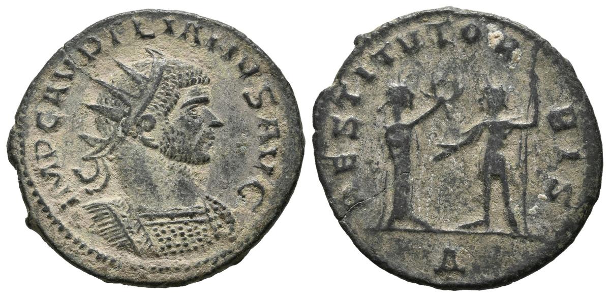 AURELIANO. Antoniniano. (Ae. 3,04g/22mm). 275 d.C. Antioquía. (RIC 386). Anv: Busto radiado y con coraza de Aureliano a derecha, alrededor leyenda: IMP C AVRELIANVS AVG. Rev: Aureliano estante a izquierda portando globo y cetro recibiendo corona de laurel de figura femenina, en exergo A, alrededor leyenda: RESTITVT ORBIS. MBC+.