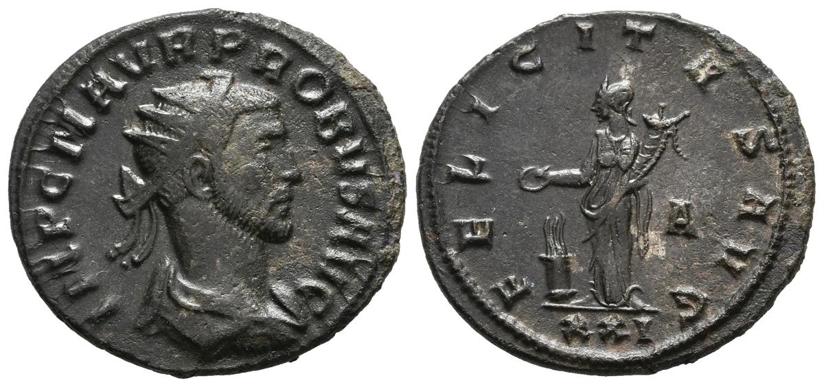 PROBO. Antoniniano. (Ae. 4,01g/23mm). 280 d.C. Siscia. (RIC 676). Anv: Busto radiado y drapeado de Probo a derecha, alrededor leyenda: IMP C M AVR PROBVS AVG. Rev: Felicitas estante a izquierda portando patera sobre altar y cornucopia, en campo A, en exergo: XXI, alrededor leyenda: FELICITAS AVG. MBC+/EBC-.