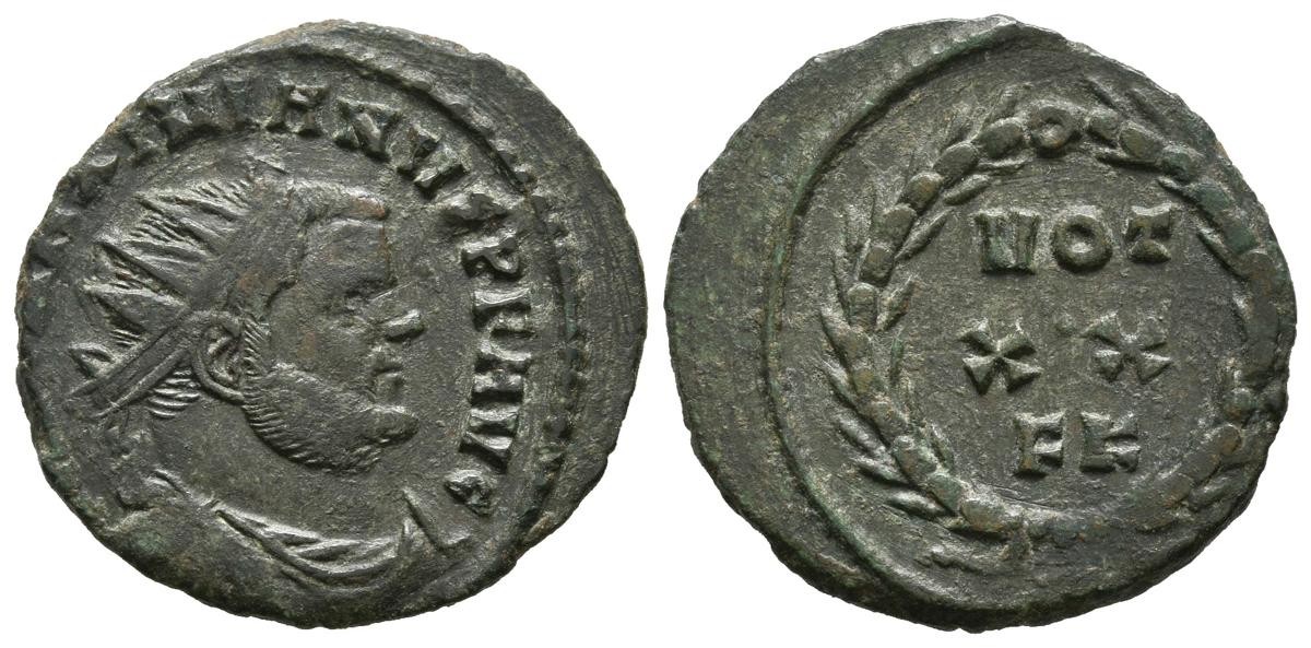 MAXIMIANO HERCULES. Ae21. (Ae. 3,12g/21mm). 303 d.C. Cártago. (RIC 37b). Anv: Busto drapeado y radiado de Maximiano Hércules a derecha, alrededor leyenda: IMP C MAXIMIANVS P F AVG. Rev: Leyenda en tres líneas: VOT/XX/FK dentro de láurea. MBC+. Escaso.