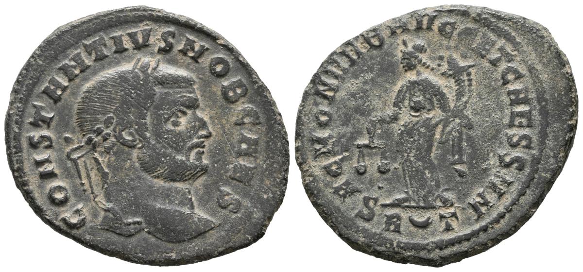 CONSTANCIO I. Follis. (Ae. 8,42g/32mm). 305-306 d.C. Roma. (RIC 112a). Anv: Cabeza laureada de Constancio I a derecha, alrededor leyenda: CONSTANTIVS NOB CAES. Rev: Moneta estante a izquierda portando escalas y cornucopia, alrededor leyenda: SAC MON VRB AVGG ET CAESS N N, en exergo: A creciente T. MBC.