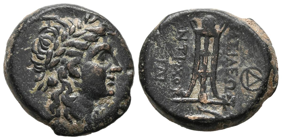 REINO SELEUCIDA, Antiocos II Theos. Ae18 (Ae. 7,13g/18mm). 261-246 a.C. Antioquía. Anv: Cabeza laureada de Apolo a derecha. Rev: Trípode, monogramas en el exterior izquierdo y derecho, ancla Seleucida debajo, alrededor leyenda griega. MBC.