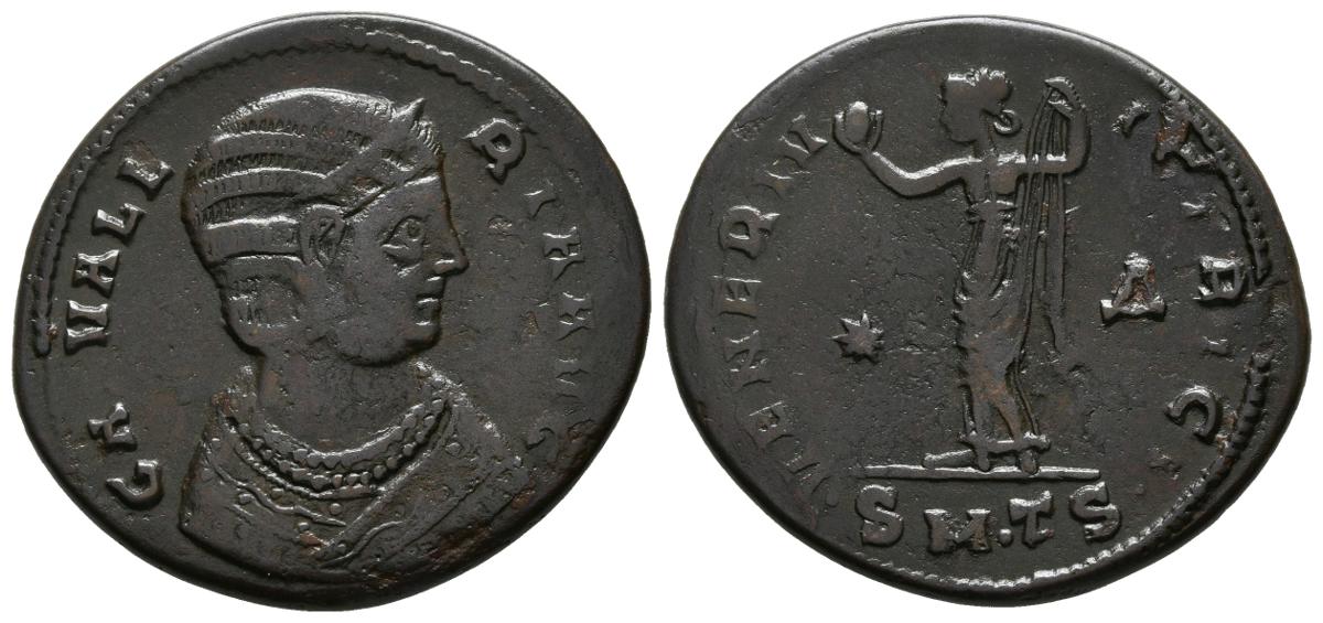 GALERIA VALERIA. Follis (Ae. 6,34/26mm). 308-311 d.C. Tesalónica. (RIC 35). Anv: busto con collar, laurel y diadema a derecha. En leyenda: GAL VALERIA AVG; Rev: Venus estante a izquierda con manzana en mano derecha. En leyenda: VENERI VICTRICI. MBC-