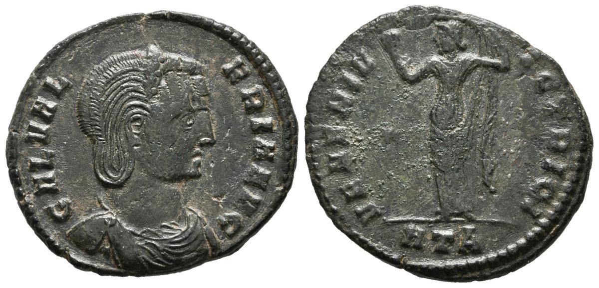 GALERIA VALERIA. Follis. (Ae. 5,80g/26mm). 308-310 d.C. Heráclea. (RIC 56). Anv: Busto drapeado, diademado y con coraza a derecha, alrededor leyenda: GAL VALERIA AVG. Rev: Venus estante a izquierda sosteniendo manzana y drapeado, alrededor leyenda: VENERI VICTRICI, en exergo: HTA. MBC.