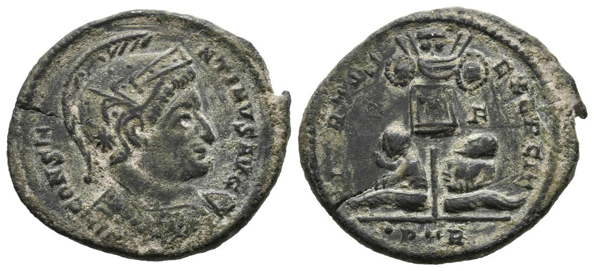 CONSTANTINO I. Nummus (Ae. 3,49g/21mm). 320 d.C. Treveri. (RIC 266). Anv: Busto con coraza y casco de Constantino I a derecha, alrededor leyenda: CONSTANTINVS AVG; Rev: Estandarte inscrito: VOT XX entre dos cautivos, en exergo PTR, alrededor leyenda: VIRTVS EXERCIT. MBC.