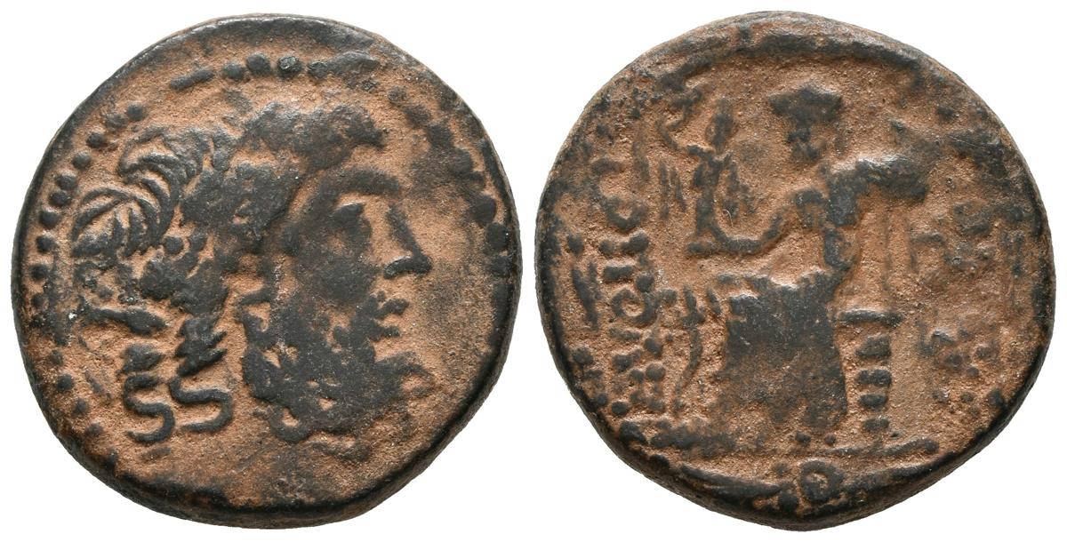 REINO SELEUCIDA. Ae (Ae. 10,15g/23mm). Siglo I a.C. Antioquía. (RPC I 4216). Anv: Cabeza laureada de Zeus a derecha. Rev: Zeus sentado a izquierda, sosteniendo a Nike en su mano derecha y lanza en la izquierda. MBC.