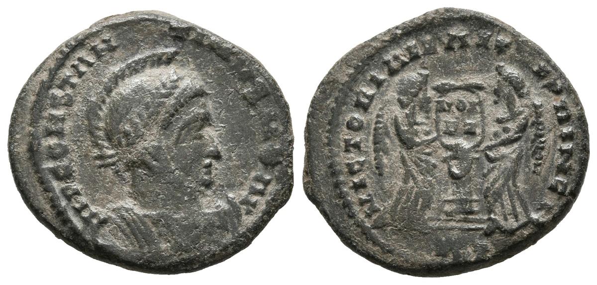 CONSTANTINO I. Follis. (Ae. 2,75g/18mm). 319 d.C. Treveri. (RIC 319). Anv: Busto drapeado con coraza y casco a derecha, alrededor leyenda: IMP CONSTANTINVS MAX AVG. Rev: Dos Victorias estantes de frente sosteniendo escudo con inscripción: VOT/PR sobre altar con estrella, en exergo: STR, alrededor leyenda: VICTORIAE LAETAE PRINC PERP. MBC.