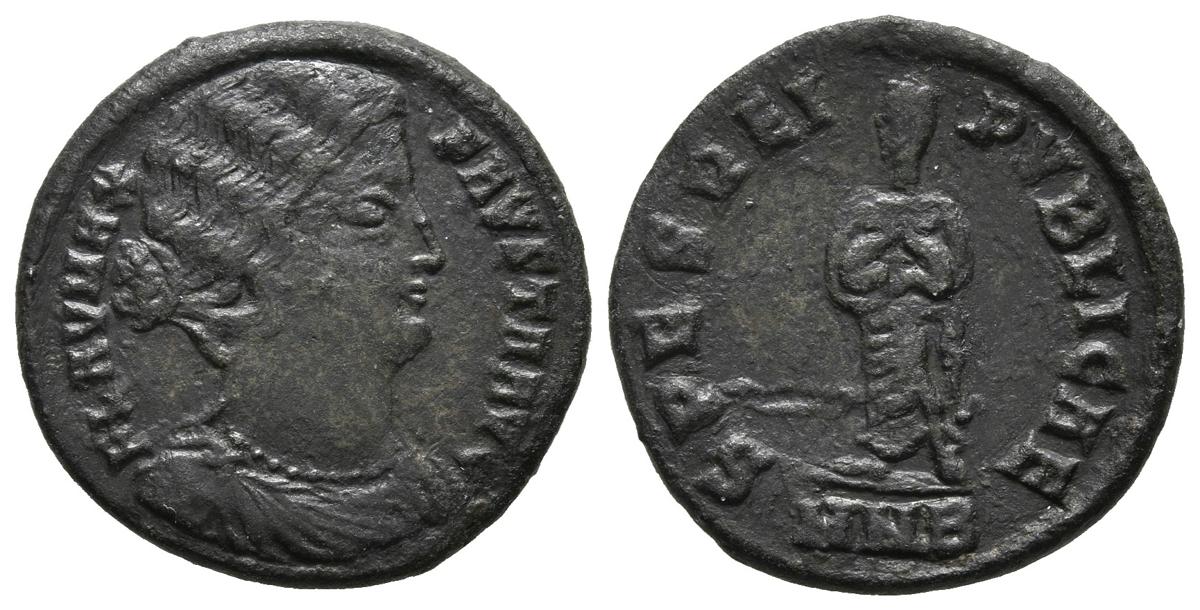 FAUSTA. Follis. (Ae. 2,55g/18mm). 324-326 d.C. Nicomedia (RIC 131). Anv: Busto drapeado de Fausta a derecha, alrededor leyenda: FLAV MAX FAVSTA AVG. Rev: Spes de pie mirando hacia la izquierda, sosteniendo a dos bebés, alrededor leyenda: SPES REIPVBLICAE. MBC+.