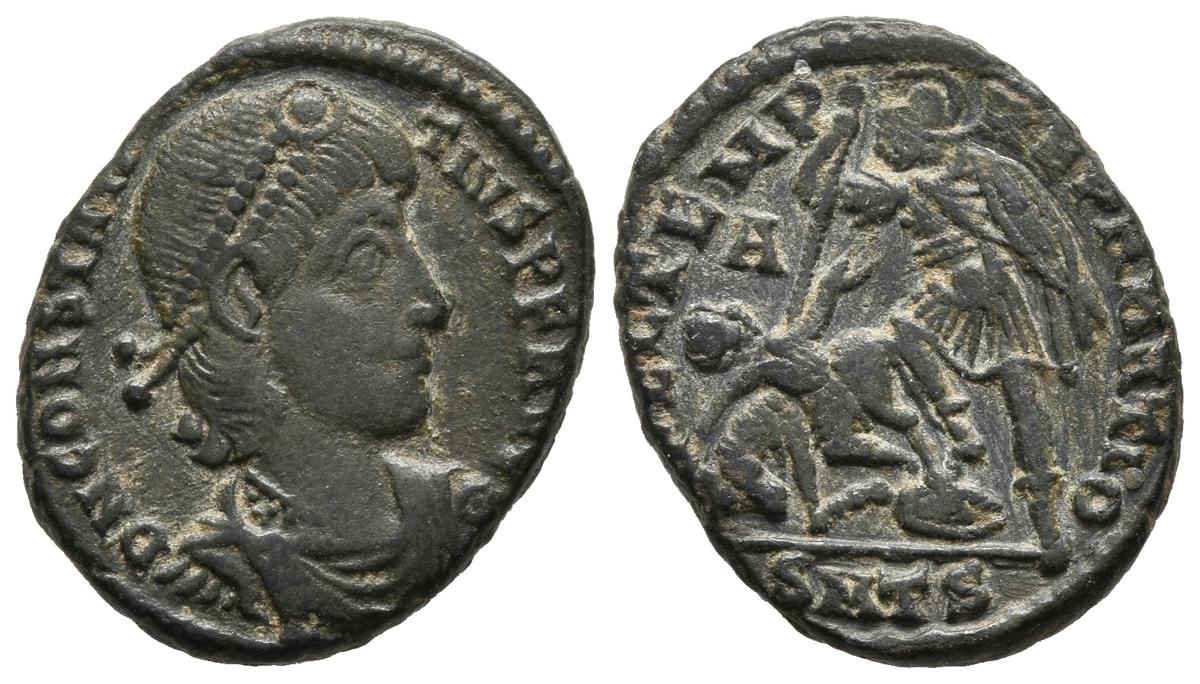 CONSTANCIO II. Follis (Ae. 3,26g/17mm). 350 d.C. Tesalónica. (RIC 129). Anv: Busto drapeado y diademado de Constancio II a derecha, alrededor leyenda: DN CONSTANTIVS PF AVG. Rev: Soldado atacando al jinete caído con cabeza descubierta y mano estirada, en exergo: SMTS, alrededor leyenda: FEL TEMP REPARATIO. MBC+.
