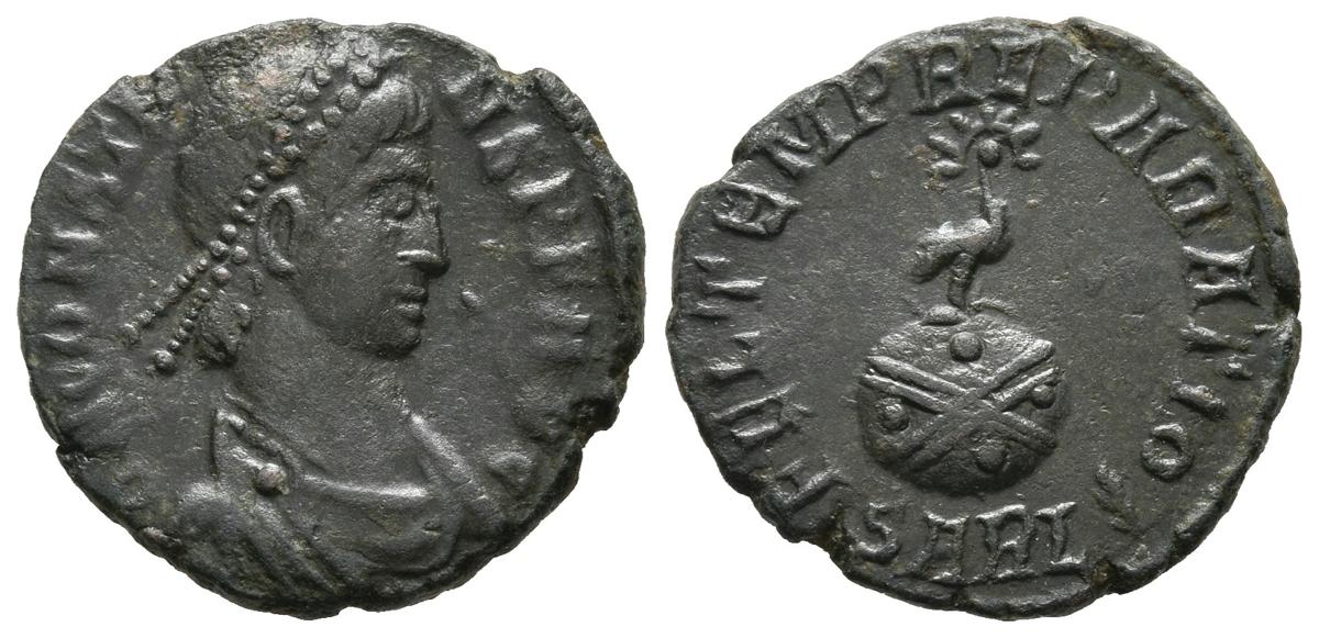 CONSTANTE. Ae17. (Ae. 2,34g/17mm). 348-350 d.C. Arles. (RIC 109). Anv: Busto diademado y drapeado de Constante a derecha, alrededor leyenda: DN CONSTANS P F AVG. Rev: Fénix radiado a derecha sobre globo, debajo: SARL, alrededor leyenda: FEL TEMP REPARATIO. MBC/MBC+.