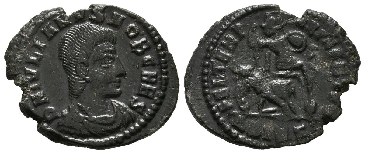 JULIANO II. Nummus (Ae. 2,67g/20mm). 361-363 d.C. Siscia. (RIC 366). Anv: busto drapeado y con coraza a derecha, en leyenda: D N IVLIAN VS NOB C HES; Rev: sodado con casco y lanza y jinete caído. Leyenda: FEL TEMP REPARATIO. MBC+/MBC.