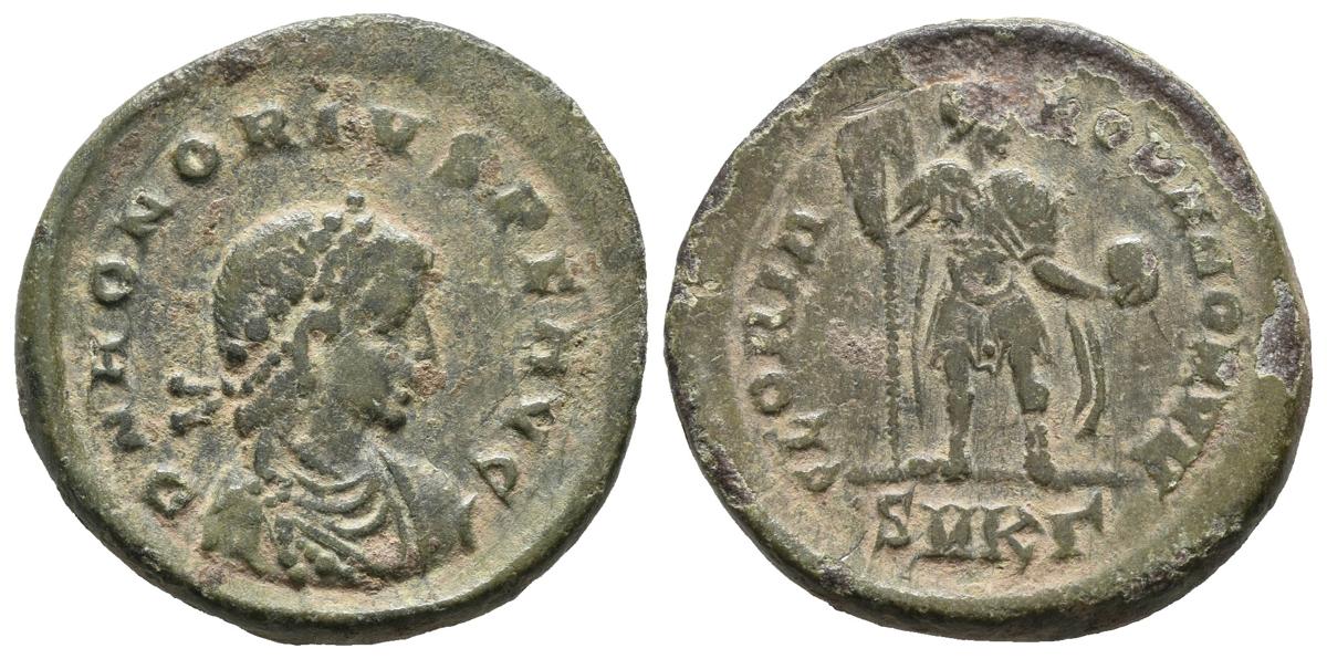 HONORIO. Follis. (Ae. 4,79g/21mm). 392-395 d.C. Cízico. (RIC 28c). Anv: Busto diademado, drapeado y con coraza de Honorio a derecha, alrededor leyenda: D N HONORIVS P F AVG. Rev: Honorio estante a derecha portando estandarte y globo, en exergo: SMKr, alrededor leyenda: GLORIA ROMANORUM. MBC-.