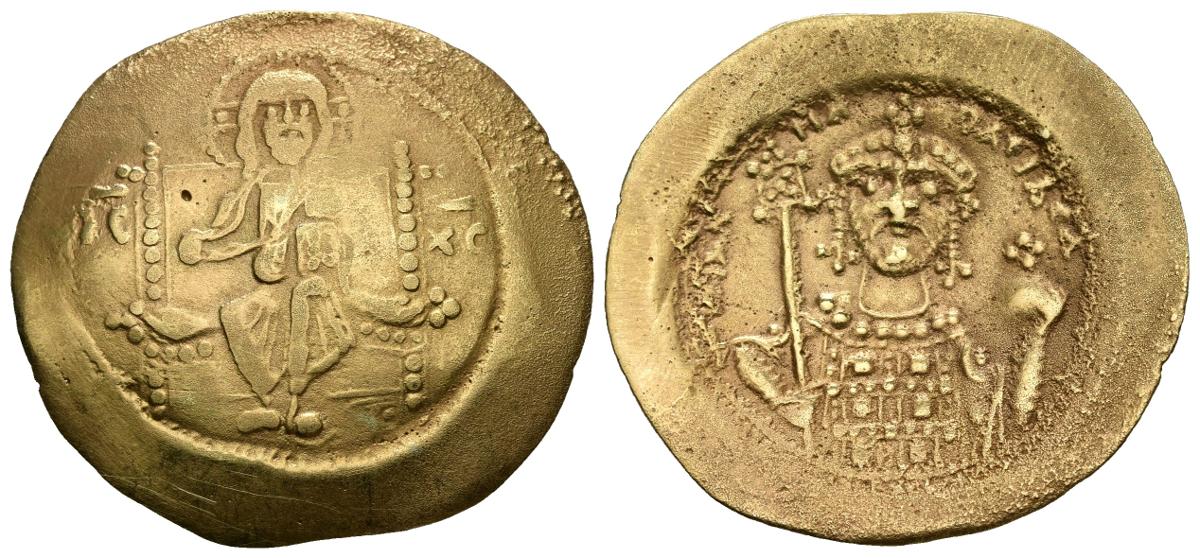 MIGUEL VII, Ducas. Histamenón Nomisma. (Au. 4,04g/27mm). 1071-1078 d.C. Constantinopla. (Sear 1869). Anv: Cristo pantocrato sentado de frente, entre IC-XC. Rev: Busto drapeado y con coraza con Miguel VII de frente portando labarum y globo crucífero. MBC/MBC+.