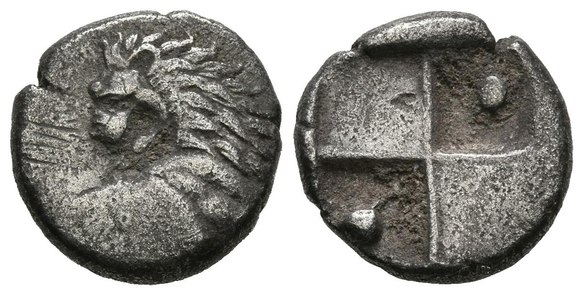TRACIA, Chersonesos. Hemidracma. (Ar. 2,27g/13mm). 386-338 a.C. (SNG Copenhagen 824-825). Anv: Parte delantera de león mirando a izquierda. Rev: Cuatripartito con dos cuadrantes incusos, en los que hay un punto en cada uno. MBC.