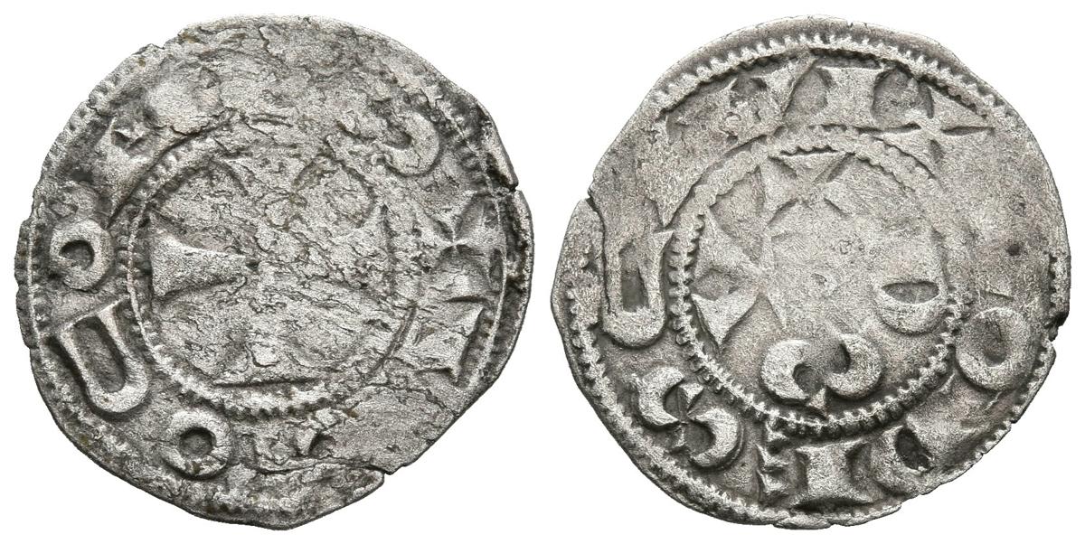 HUG I, II y III (1132-1196). Diner. (Ve. 0,79g/18mm). Condado de Rodes (probablemente situado en Rosas, Gerona). (Cru V.S. 154). Anv: Cruz y letras: DAS, alrededor leyenda: RODES CIVI. Rev: Cruz interior patada, alrededor leyenda: VGO COMES. MBC-.