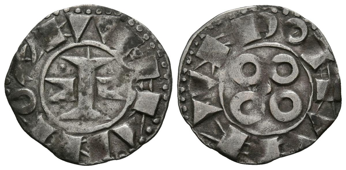SEÑORIO DE MONTPELLIER (1204-1349), Anónimo. Dinero melgorés. (Ve. 0,81g/18mm). Montpeller. (Cru V.S. 163). Anv: I entre mitras y puntos, alrededor leyenda: NARBONA. Rev: Cuatro puntos, alrededor leyenda: RAIMVNO. MBC+.