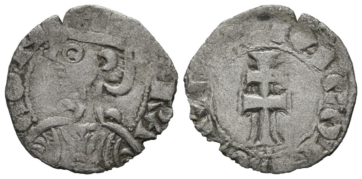 JAIME I (1213-1276). Dinero. (Ve. 0,80g/17mm). Aragón. (Cru V.S. 318). Anv: Efigie coronada a izquierda, alrededor leyenda: ARAGON. Rev: Cruz patriarcal, alrededor leyenda: IACOBVS REX. MBC-.