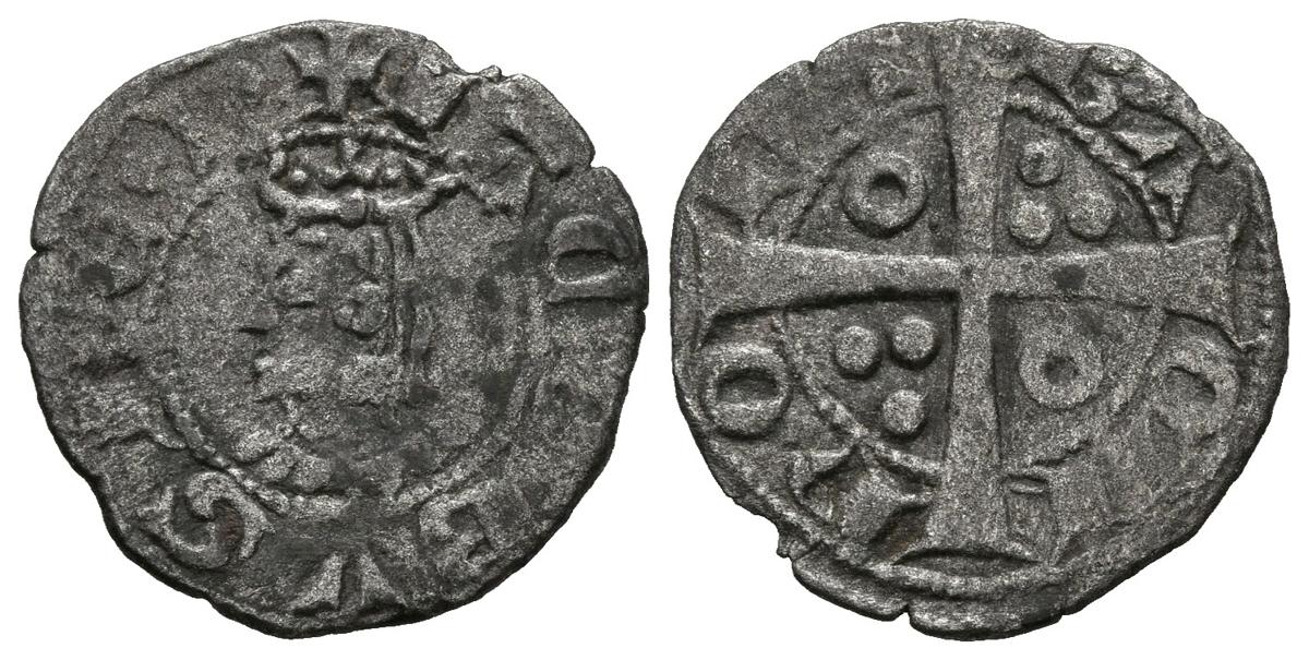 JAIME II (1291-1327). Dinero. (Ve. 0,81g/16mm). Barcelona. (Cru V.S. 344). Anv: Efigie a izquierda, alrededor leyenda: IACOBVS REX. Rev: Cruz pasante con anillos en primer y cuarto cuadrante y tres puntos en segundo y tercer cuadrante, alrededor leyenda: BARQVINO. MBC.
