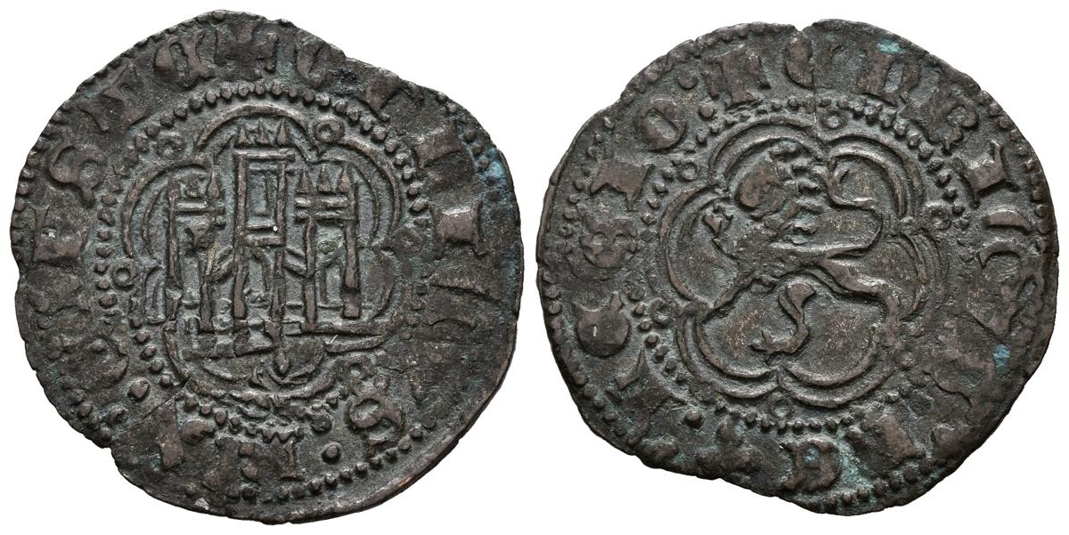 ENRIQUE III (1390-1406). Blanca (Ve. 1,88g/25mm). S/D. Sin marca de ceca. (FAB-596). Anv: castillo dentro de gráfila lobular, en leyenda: ENRICVS DEI GRACIA; Rev: león rampante a izquierda en gráfila de 6 lóbulos. Misma leyenda que en anverso. MBC.