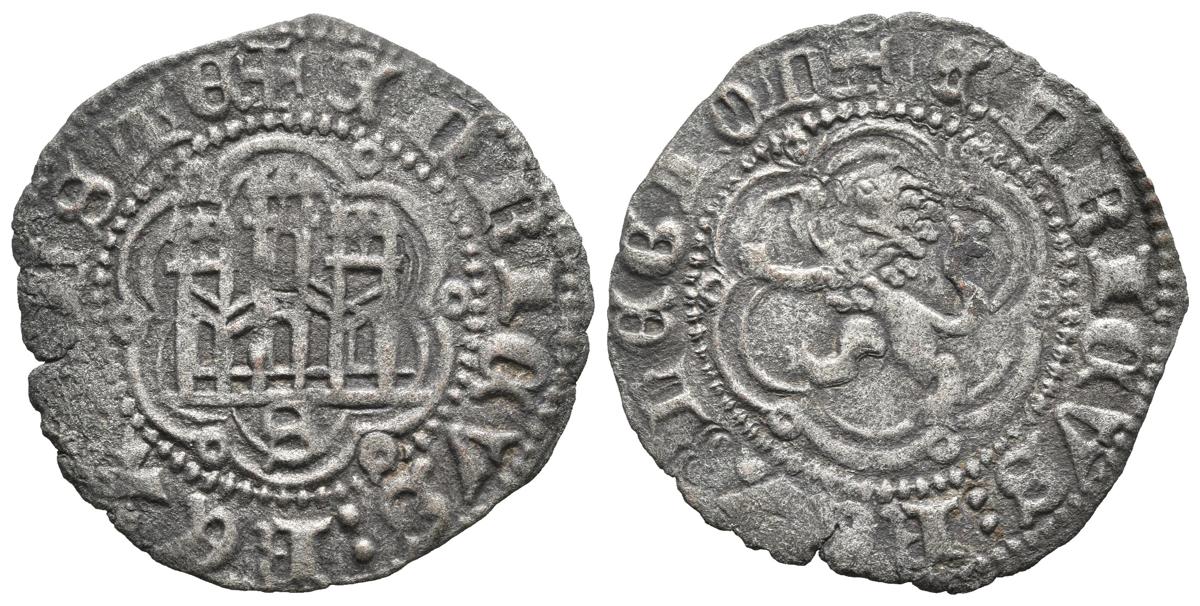 ENRIQUE III (1390-1406). Blanca. (Ve. 1,47g/24mm). Sevilla. (FAB 602). Anv: Castillo de tres torres, debajo S, alrededor leyenda: ENRICVS REX CAST. Rev: León rampante a izquierda dentro de grafila lobular, alrededor leyenda: ENRICVS REX LEGION. MBC.
