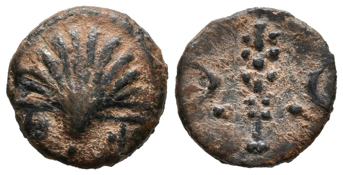 ARSE-SAGUNTO (Sagunto, Valencia). 1/8 Calco. (Ae. 1,39g/13mm). 300-200 a.C. (FAB-2045). Anv: Concha. Rev: Clava entre crecientes y puntos. MBC. Rarísimo ejemplar.