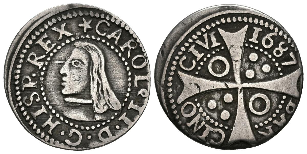 CARLOS II (1665-1700). 1 Croat. (Ar. 2,19g/21mm). 1687. Barcelona. (Cal-2019-210). MBC+. Bonito ejemplar.
