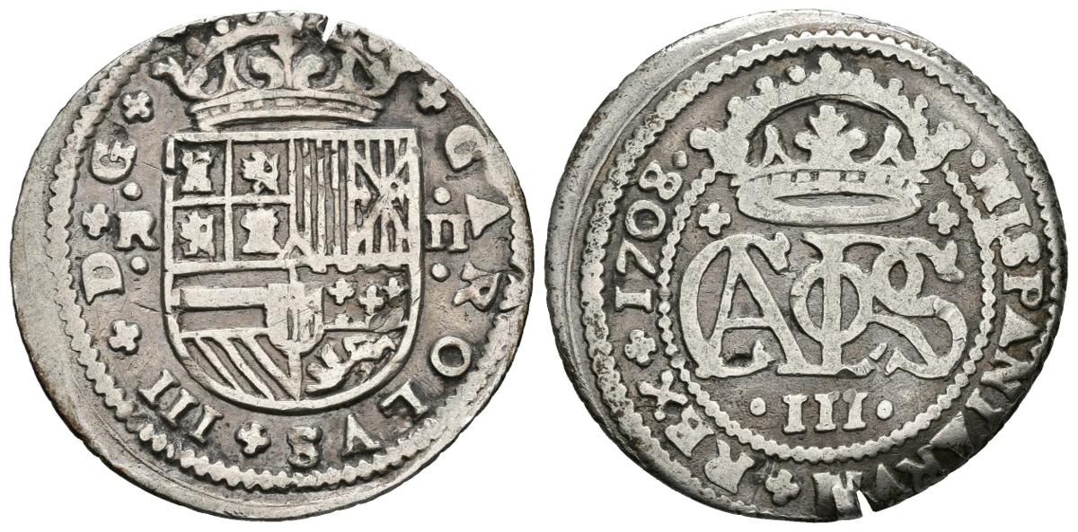 CARLOS III, el Pretendiente (1700-1714). 2 Reales. (Ar. 4,37g/27mm). 1708. Barelona. (Cal-2019-29). MBC.