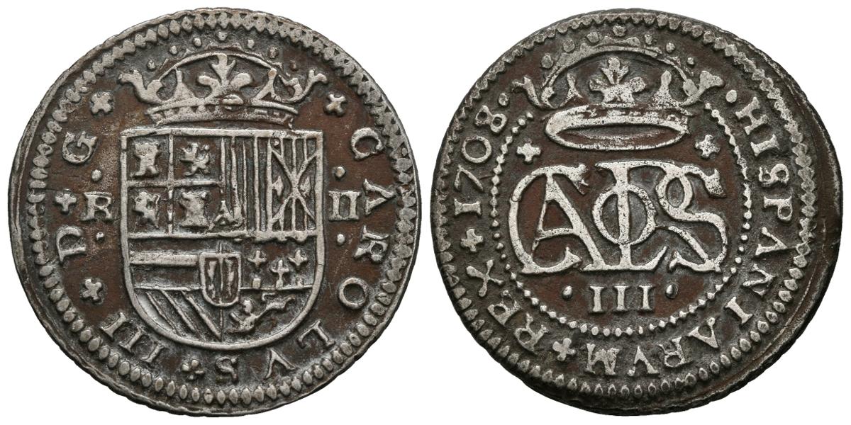 CARLOS III, el Pretendiente (1700-1714). 2 Reales. (Ar. 4,62g/25mm). 1708. Barcelona. (Cal-2019-29). MBC-.