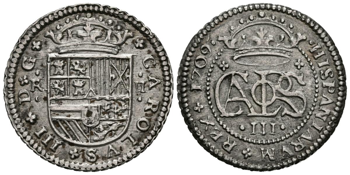 CARLOS III, el Pretendiente (1700-1714). 2 Reales. (Ar. 5,23g/27mm). 1709. Barcelona. (Cal-2019-30). MBC+.