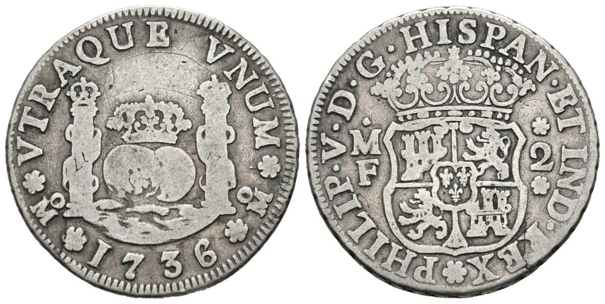 FELIPE V (1700-1746). 2 Reales (Ar. 6,35g/26mm). 1736. México MF. (Cal-2019-815). MBC-.