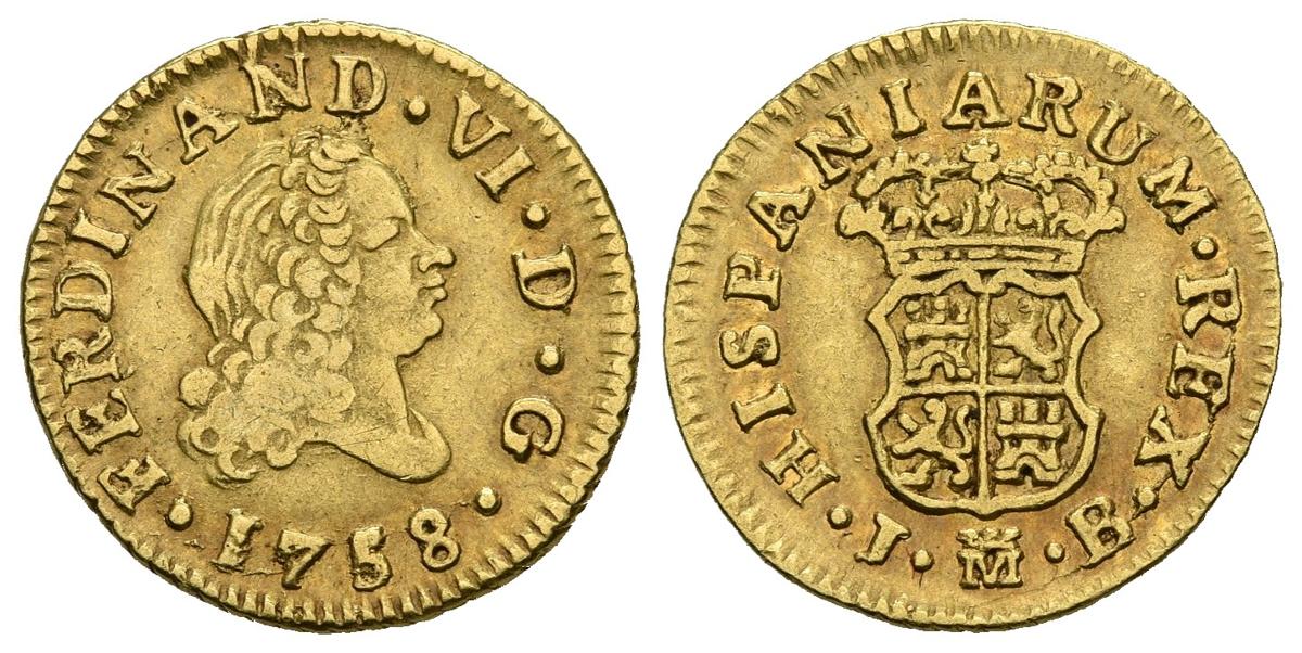 FERNANDO VI (1746-1759). 1/2 Escudo (Au. 1,75g/15mm). 1758. Madrid JB. (Cal-2019-564). Cuarto busto. MBC/MBC+. Precioso tono.