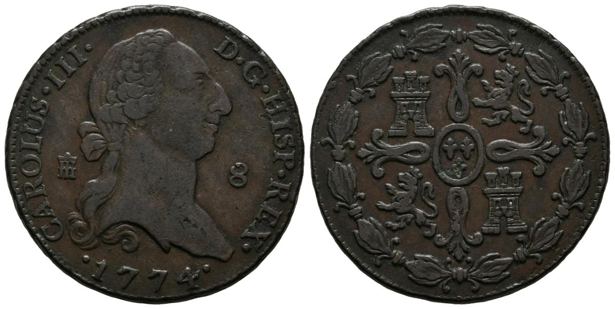 CARLOS III (1759-1788). 8 Maravedís (Ae. 11,75g/30mm). 1774. Segovia. (Cal-2019-71). MBC/MBC+.