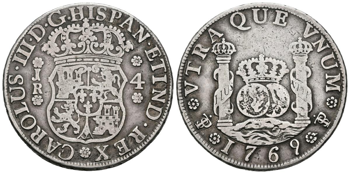 CARLOS III (1759-1788). 4 Reales. (Ar. 13,07g/32mm). 1769. Potosí JR. (Cal-2019-995). 9 de la fecha recto. MBC-.
